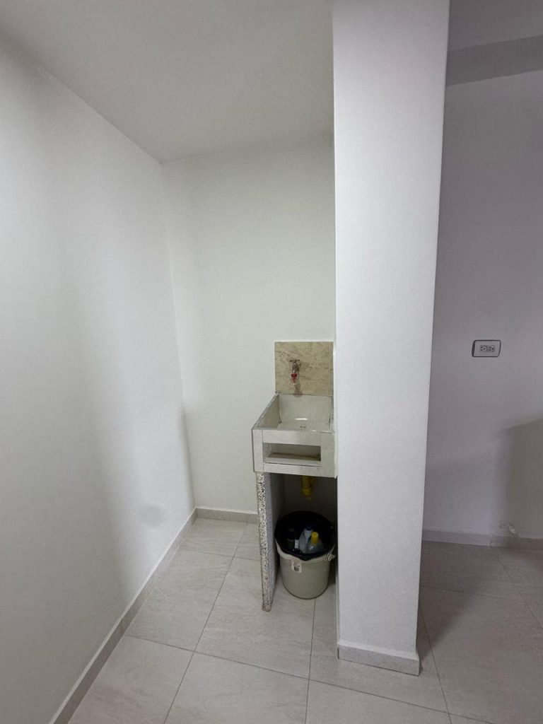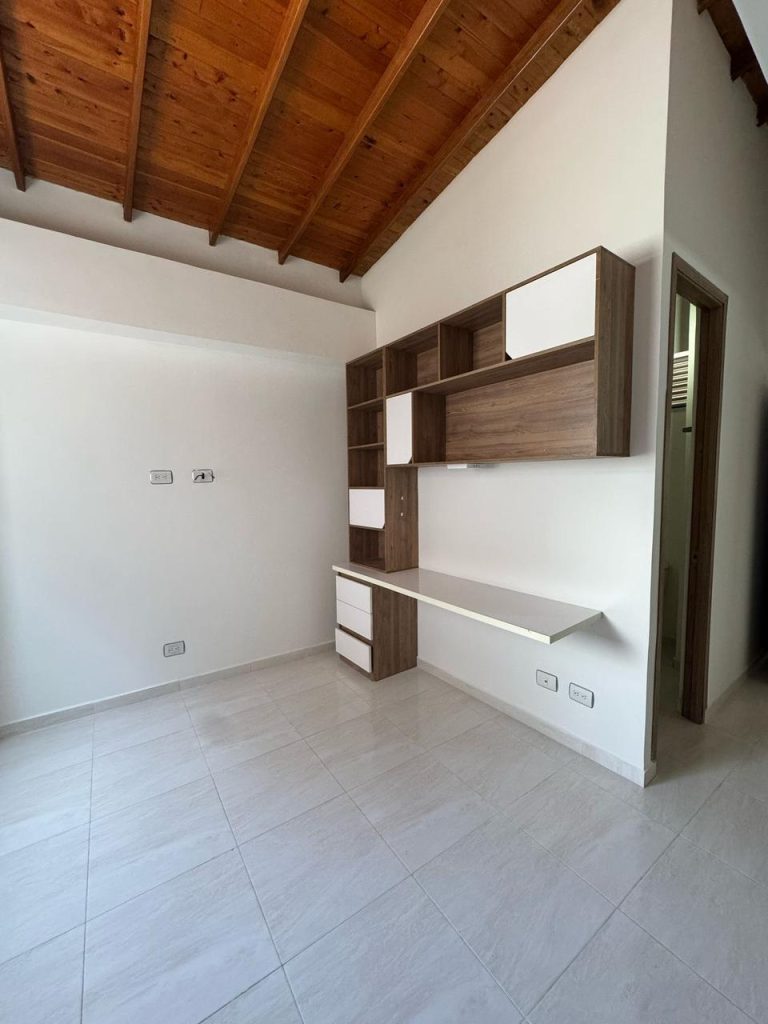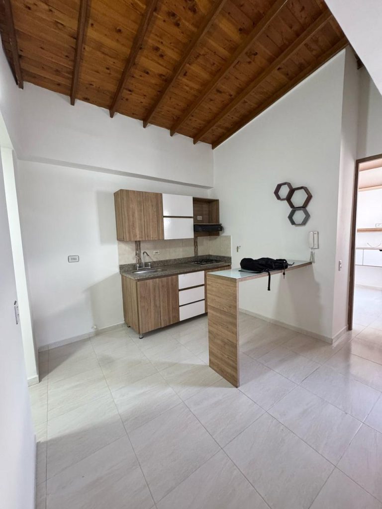 Salón, cocina integral, 1 baño, zona de ropas independiente, 1 habitación con clóset, piso en madera a doble altura.